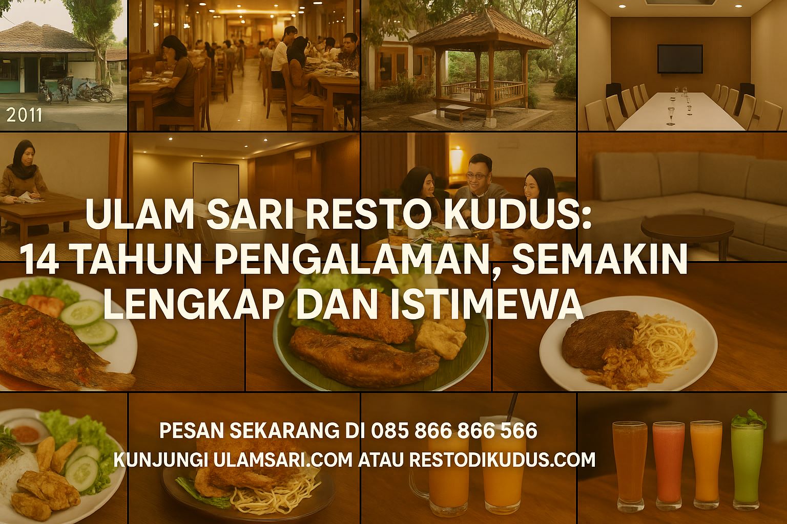 Ulam Sari Resto Kudus kini genap berusia 14 tahun dan terus menunjukkan eksistensinya sebagai restoran keluarga terfavorit di Kudus. Dengan perjalanan panjang sejak tahun 2011, restoran ini tumbuh semakin matang dalam menyajikan cita rasa dan pelayanan terbaik.